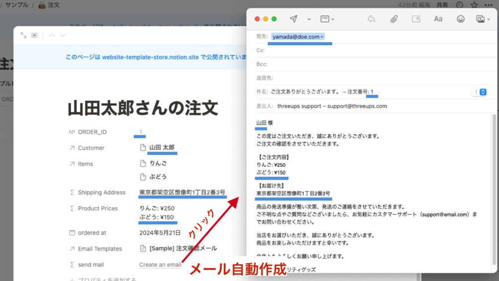 データベースの情報をテンプレートに自動で差し込み、メールを作成します。